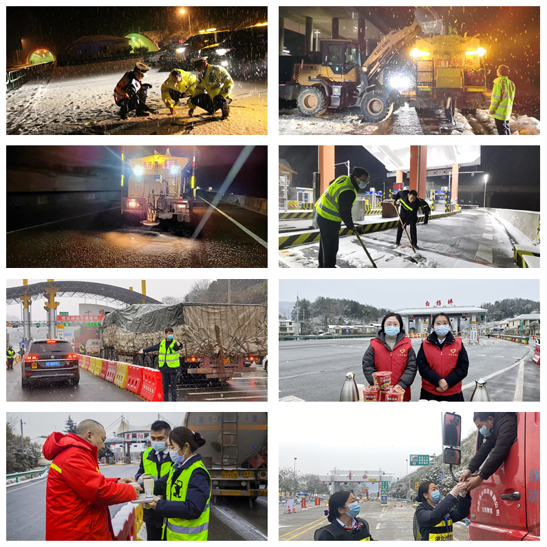 期間,各路段管理單位與高警、路政部門(mén)協(xié)同開(kāi)展應急保暢工作,各綜合巡檢辦及時(shí)做好人員機械集結、融雪物資裝配、應急作戰排班、警示標牌擺放等工作,及時(shí)撒布融雪劑,清理道路冰雪;路段集中監控點(diǎn)及時(shí)發(fā)布最新路況及天氣信息,引導司乘安全出行;各收費站口組織志愿者,為過(guò)往司乘免費提供日常應急藥品、熱水和便捷食品。
