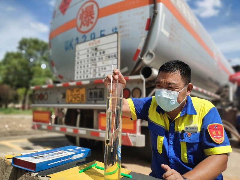 “要確保每一滴油都對得起消費者”。罐車(chē)到達孝感加油站,現場(chǎng)體感溫度超50℃,站長(cháng)張攀依然在對油品進(jìn)行可視化檢查,嚴格把控油品驗收?!跋郎骋3指稍?,因為有水分的話(huà)遇到火后會(huì )飛濺,易傷人?!彬炇胀暧推?,張攀繼續檢查油站消防沙情況??谡窒瞒詈诘哪橗嬙缫巡紳M(mǎn)汗水和油光,烈日下被汗水浸濕的工裝也悄悄變了色。