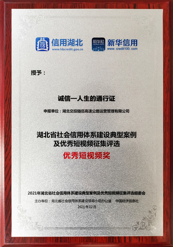 此次評選活動(dòng)由湖北省社會(huì )信用體系建設領(lǐng)導小組辦公室聯(lián)合中國經(jīng)濟信息社共同主辦,經(jīng)過(guò)專(zhuān)家評審及網(wǎng)絡(luò )評審程序,最終確定了40個(gè)案例、25個(gè)短視頻分別獲評信用典型案例和優(yōu)秀短視頻,隨岳運營(yíng)公司拍攝的《誠信——人生的通行證》視頻被評為優(yōu)秀短視頻,并屬企業(yè)類(lèi)代表作品。