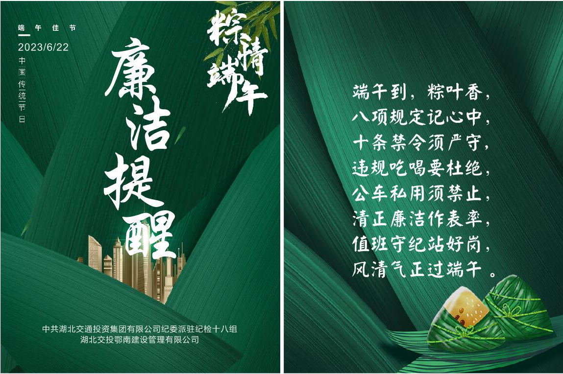 端午到、粽葉香,八項規定記心中,十條禁令須嚴守,違規吃喝要杜絕,公車(chē)私用須禁止,清正廉潔作表率,值班守紀站好崗,風(fēng)清氣正過(guò)端午。