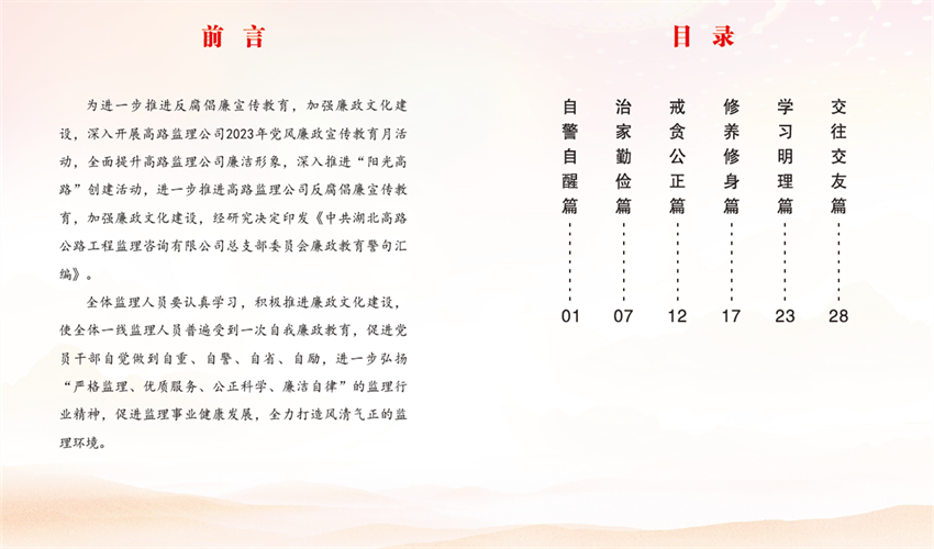 高路監理公司:召開(kāi)2023年黨風(fēng)廉政建設宣傳教育月活動(dòng)推進(jìn)會(huì )暨警示教育大會(huì ),黨總支書(shū)記、執行董事張建功以《講黨性 守紀律 敢擔當 懂知足》為題講廉政黨課。制發(fā)“宣教月”活動(dòng)倡議書(shū),督促基層單位深入開(kāi)展廉潔教育?;鶎涌偙O辦、駐地辦制作橫幅、宣傳展板,營(yíng)造“廉潔監理”氛圍。對項目公司進(jìn)行回訪(fǎng)、對施工單位進(jìn)行走訪(fǎng)、對作業(yè)班組進(jìn)行暗訪(fǎng),了解派出監理機構的廉潔情況。面向全員征集廉潔箴言警句,印發(fā)廉政教育警句匯編近600本。