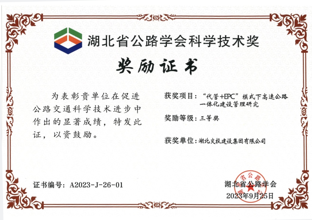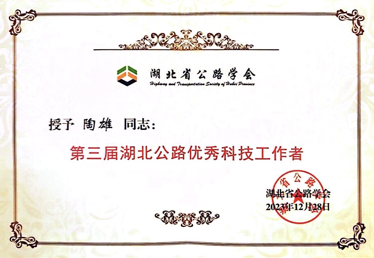 大會(huì )還對 2023 年度湖北省公路學(xué)會(huì )科學(xué)技術(shù)獎、第三屆湖北公路優(yōu)秀科技工作者進(jìn)行了表彰,建設集團主持研究的“‘代管+EPC’模式下高速公路一體化建設管理研究”獲評2023年度湖北省公路學(xué)會(huì )科學(xué)技術(shù)獎,黃橋連、陶雄獲評第三屆湖北公路優(yōu)秀科技工作者。