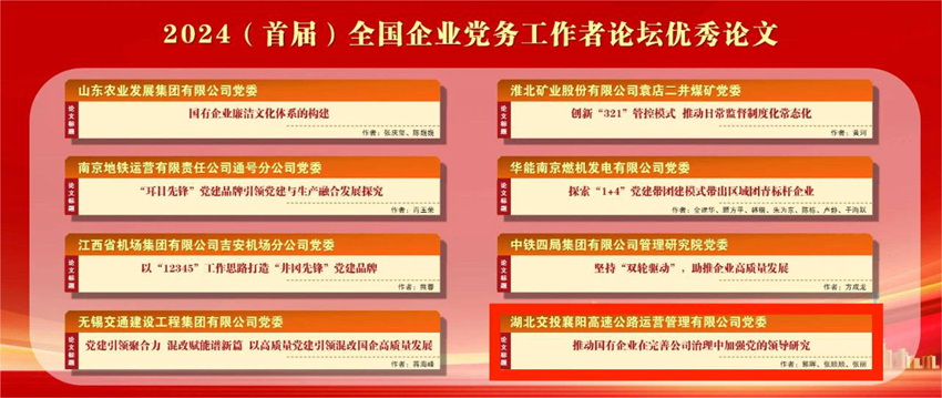 4月13日,以“發(fā)揮黨建對企業(yè)高質(zhì)量發(fā)展的引領(lǐng)保障作用,發(fā)展新質(zhì)生產(chǎn)力,推進(jìn)中國式現代化”為主題的“2024(首屆)全國企業(yè)黨務(wù)工作者論壇”在北京隆重舉行。論壇發(fā)布了優(yōu)秀論文名單,由湖北交投襄陽(yáng)運營(yíng)公司黨委報送的《推動(dòng)國有企業(yè)在完善公司治理中加強黨的領(lǐng)導研究》和《踐行“四下基層” 厚植為民本色》兩篇論文從1025家企業(yè)800余篇論文中脫穎而出,獲評“2024(首屆)全國企業(yè)黨務(wù)工作者論壇優(yōu)秀論文”。