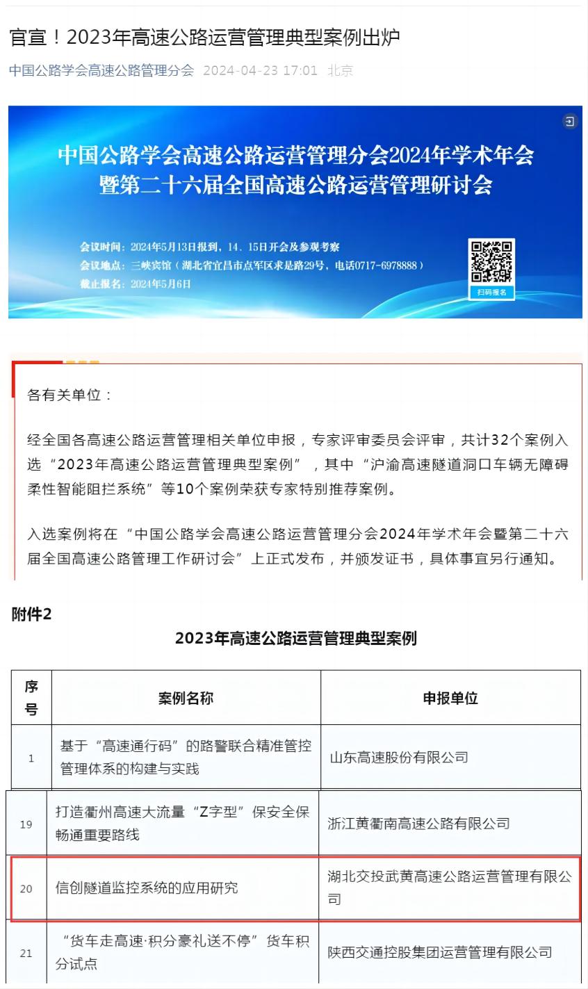 近日,2023年高速公路運營(yíng)管理典型案例新鮮出爐,武黃運營(yíng)公司申報的《信創(chuàng )隧道監控系統的應用研究》在全國各高速公路的案例角逐中脫穎而出,成功入選。入選案例將在“中國公路學(xué)會(huì )高速公路運營(yíng)管理分會(huì )2024年學(xué)術(shù)年會(huì )暨第二十六屆全國高速公路管理工作研討會(huì )”上正式發(fā)布。這是公司運營(yíng)管理典型案例首次被收入中國公路學(xué)會(huì )典型案例,實(shí)現了“零”的突破,也是科創(chuàng )研發(fā)卓越實(shí)力的最好見(jiàn)證。