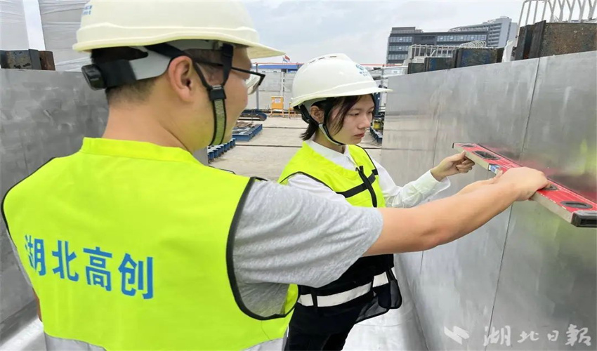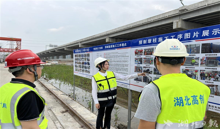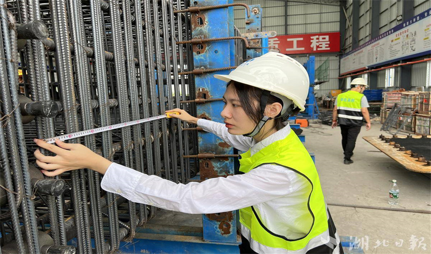 5月2日,廣東省中山市公路兩旁的木棉花鮮紅似火,古鎮公路建設熱火朝天。只見(jiàn)機械巨臂在空中舞動(dòng),一榀榀預制蓋梁已運輸就位,施工人員正為吊裝做準備。人頭攢動(dòng)的男人群里,一位頭戴“高創(chuàng )監理”白色安全帽的女監理員格外醒目。她是27歲的湖北高創(chuàng )監理公司監理員劉婕,此刻正拿著(zhù)量尺,對蓋梁鋼筋間距進(jìn)行抽檢。