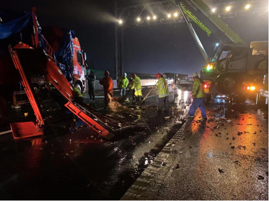 2024年5月1日凌晨12時(shí)28分,滬渝高速公路700KM+300M 處突發(fā)一起交通事故,一輛大貨車(chē)突然側翻,造成道路通行中斷。時(shí)值“五一”假期車(chē)流高峰期,車(chē)流量巨大,嚴重影響了道路正常通行。險情就是命令,鄂東區域分公司黃黃分部在接到通知后,立即啟動(dòng)應急預案,第一時(shí)間安排養護人員奔赴現場(chǎng)與民警和施救公司齊心救治,攜手保暢。僅用30分鐘,車(chē)輛側翻導致散落路面的15噸貨物全部轉移,快速搶通擁堵路段,恢復正常通行。