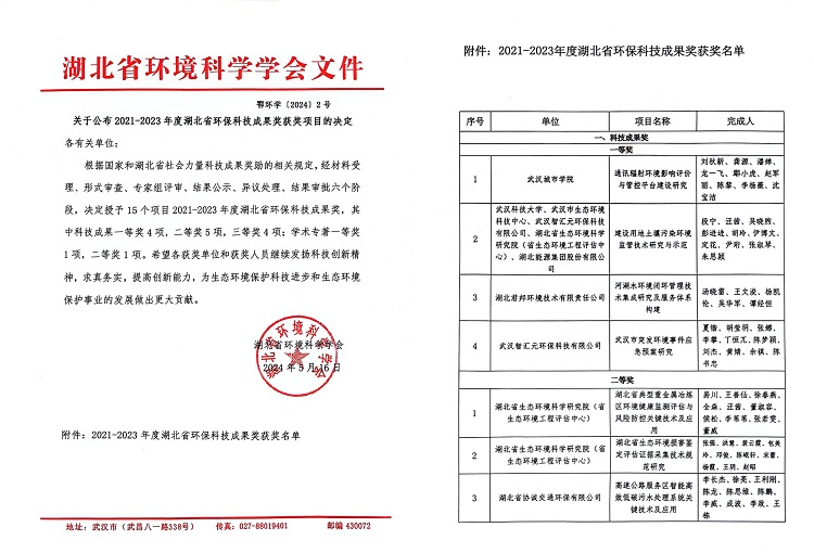 湖北省環(huán)??萍汲晒勈敲嫦蛉∩鷳B(tài)環(huán)境行業(yè)的權威科技獎項,旨在鼓勵科技創(chuàng )新,推動(dòng)我省生態(tài)環(huán)境科學(xué)技術(shù)發(fā)展,表彰在環(huán)保技術(shù)創(chuàng )新和成果轉化方面取得顯著(zhù)成就的企事業(yè)單位和個(gè)人。