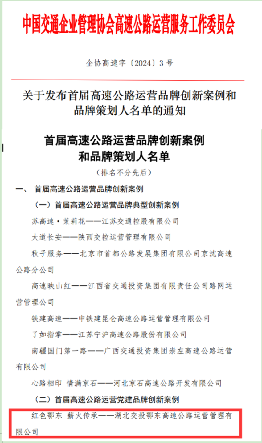 近日,中國交通企業(yè)管理協(xié)會(huì )高速公路運營(yíng)服務(wù)工作委員會(huì )發(fā)布了首屆高速公路運營(yíng)品牌創(chuàng )新案例和品牌策劃人名單,鄂東運營(yíng)公司“紅色鄂東 薪火傳承”黨建品牌獲評首屆高速公路運營(yíng)黨建品牌創(chuàng )新案例。