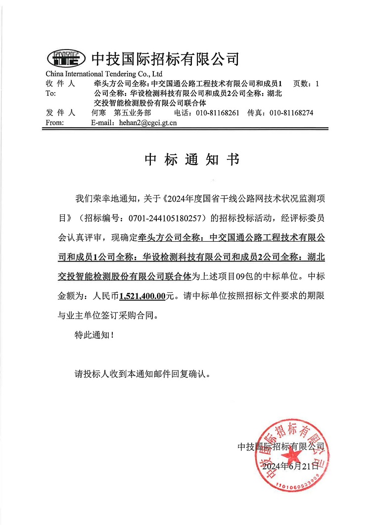 6月21日,從中國政府采購網(wǎng)獲悉,由中交國通、華設檢測以及智能檢測公司組成的聯(lián)合體成功中標交通運輸部“2024年度國省干線(xiàn)公路網(wǎng)技術(shù)狀況監測項目”09包,這標志著(zhù)公司再次順利取得參與國家級路網(wǎng)監測項目的重要資格,也是公司連續第二年成功參與國檢項目。