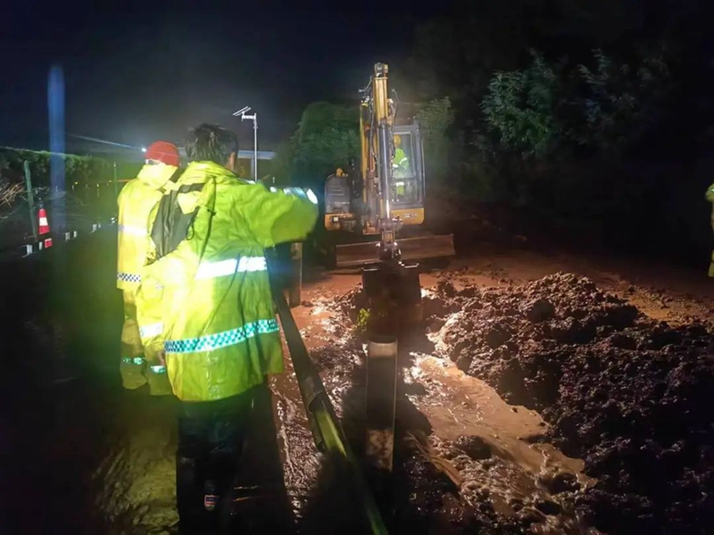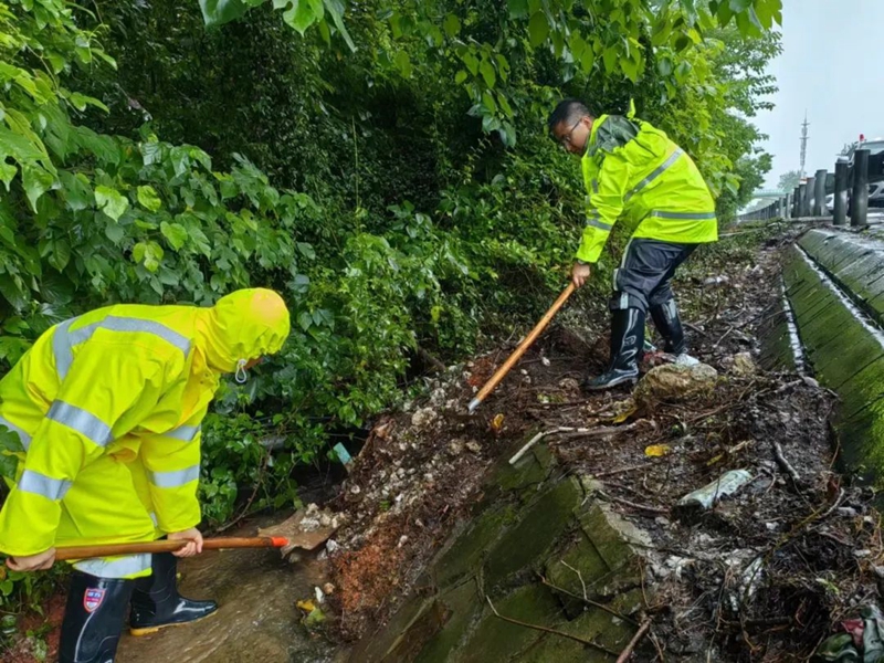 險情就是命令。張鼎立即報告值班領(lǐng)導,第二黨總支、巡檢辦及時(shí)通知駐地高監辦、項目部和養護施工單位。一方面迅速擺放警示錐桶,揮舞熒光棒,進(jìn)行現場(chǎng)安全通行警戒,另一方面及時(shí)調配1臺挖機在路側擴建施工的填土處,現場(chǎng)挖出一條寬約50公分、長(cháng)約150米的排水溝到與排水引流處。3時(shí)31分,雨水順著(zhù)排水溝順利排出,路面無(wú)明顯積水,成功排除了安全隱患,車(chē)輛通行正常。