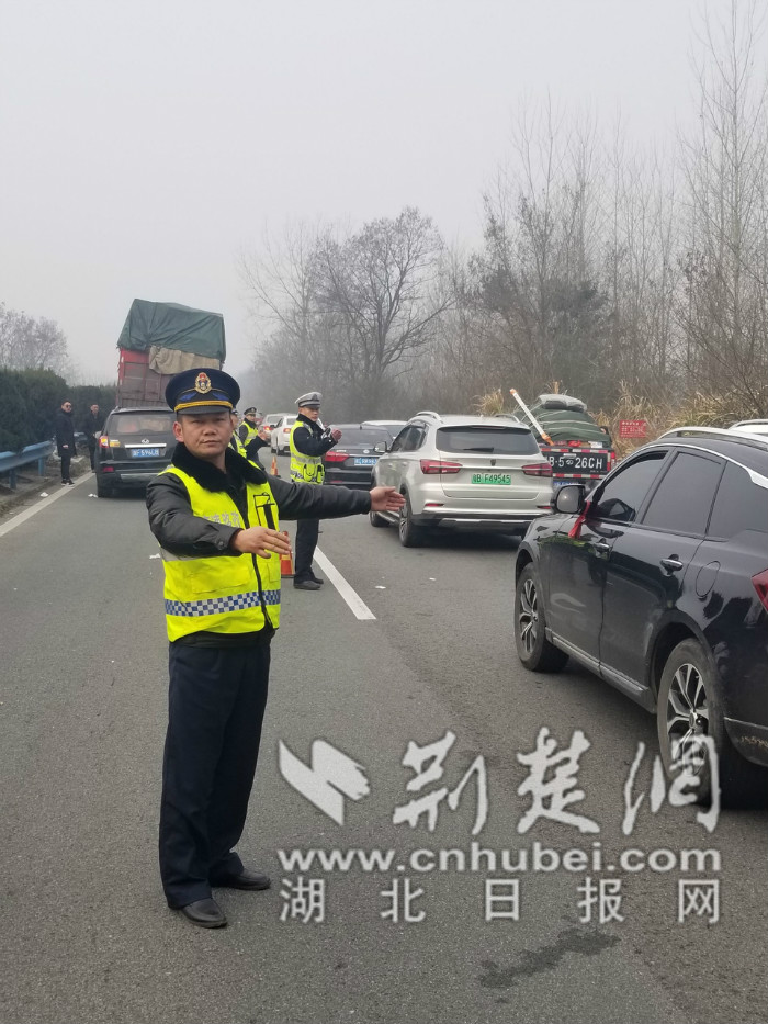 濃霧天氣,路政人員在故障車(chē)輛后方實(shí)施交通管制,引導主線(xiàn)車(chē)流安全有序通過(guò)