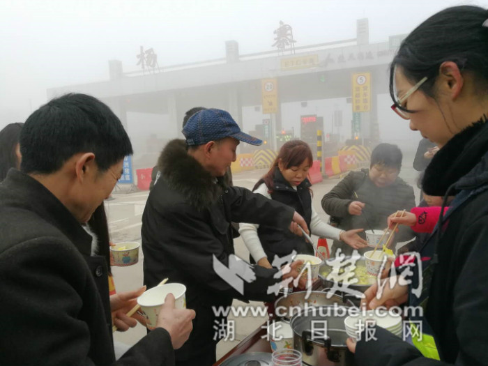 楊寨所因大霧管制入口,部分車(chē)輛人員滯留收費廣場(chǎng),大部分人員沒(méi)吃早餐,天氣寒冷,管理所為滯留人員免費提供面條、熱粥和熱水,獲得司乘人員稱(chēng)贊!