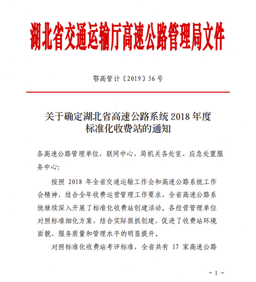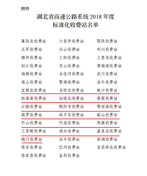 2月19日,湖北省交通運輸廳高速公路管理局發(fā)布湖北省高速公路系統2018年度標準化收費站名單,湖北交投宜都北等19個(gè)收費站榮獲2018年度標準化收費站稱(chēng)號,占全省44個(gè)獲評收費站的43%。