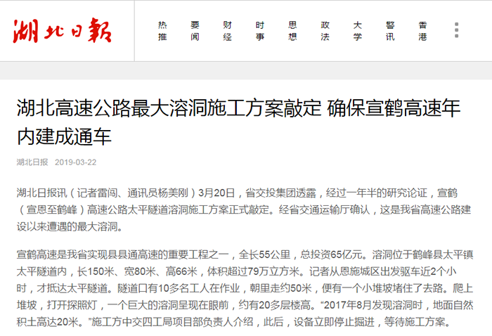 3月20日,省交投集團透露,經(jīng)過(guò)一年半的研究論證,宣鶴(宣恩至鶴峰)高速公路太平隧道溶洞施工方案正式敲定。經(jīng)省交通運輸廳確認,這是我省高速公路建設以來(lái)遭遇的最大溶洞。