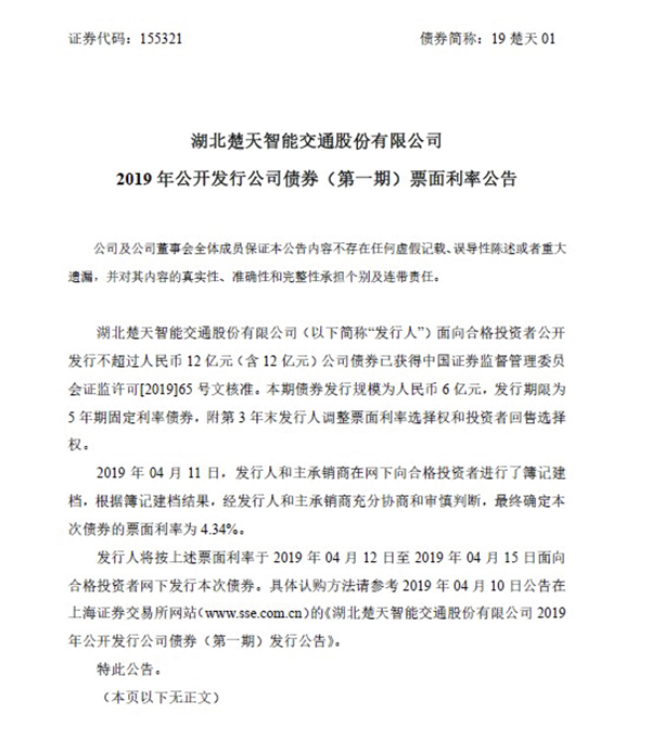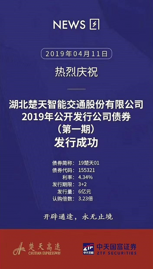 楚天公司于2019年1月18日收到中國證券監督管理委員會(huì )出具的《關(guān)于核準湖北楚天智能交通股份有限公司向合格投資者公開(kāi)發(fā)行公司債券的批復》,4月11日,(第一期)公司債券6億元順利完成簿記建檔,認購量達到19.38億元,認購倍數達到3.23倍,為4月份市場(chǎng)認購活躍度最高的債券之一,債券最終票面利率為4.34%,較近三個(gè)月AA+評級的國企(含央企)發(fā)行的無(wú)擔保小公募公司債平均發(fā)行利率低74bp,已經(jīng)接近AAA級小公募4月份平均的利率4.31%。