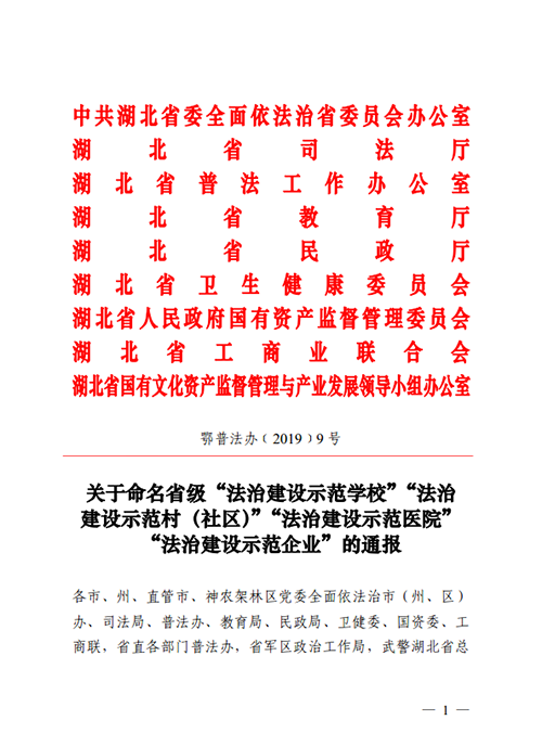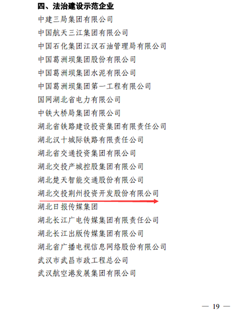 近日,湖北省普法工作辦公室印發(fā)《關(guān)于命名省級“法治建設示范學(xué)?!薄胺ㄖ谓ㄔO示范村(社區)”“法治建設示范醫院”“法治建設示范企業(yè)”的通報》,湖北交投荊州投資開(kāi)發(fā)股份有限公司獲評2019年“湖北省法治建設示范企業(yè)”。