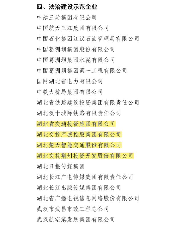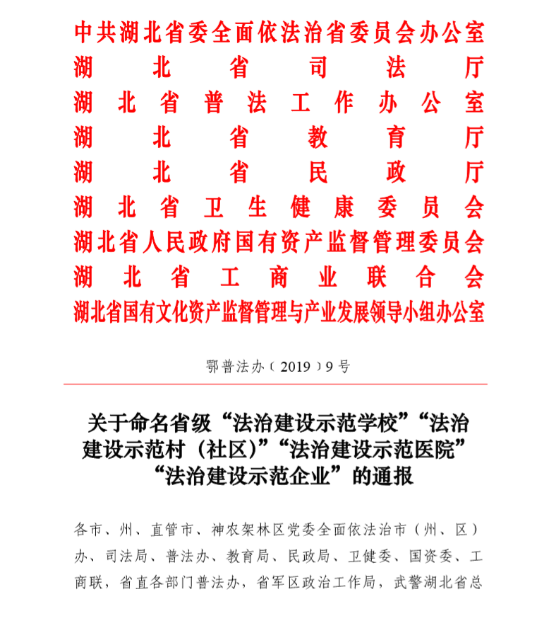 近日,湖北省普法工作辦公室印發(fā)《關(guān)于命名省級“法治建設示范學(xué)?!薄胺ㄖ谓ㄔO示范村(社區)”“法治建設示范醫院”“法治建設示范企業(yè)”的通報》(鄂普法辦〔2019〕9號),湖北交投四家單位獲評“湖北省法治建設示范企業(yè)”。