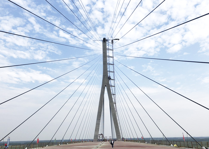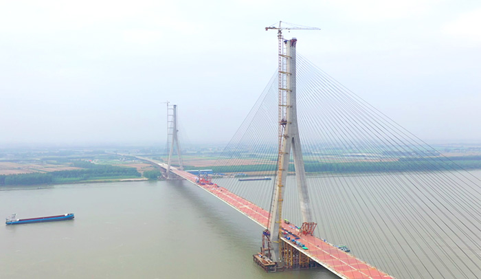 總投資31.44億元的嘉魚(yú)長(cháng)江大橋,全長(cháng)4.66公里,項目起于洪湖市燕窩鎮,止于嘉魚(yú)縣新街鎮,是武漢城市圈環(huán)線(xiàn)高速公路的跨江通道。主橋長(cháng)1650米,為保證長(cháng)江通航要求,大橋采用主跨920米的非對稱(chēng)單側混合梁雙塔雙索面斜拉橋設計,跨徑居同類(lèi)型橋梁世界第一。