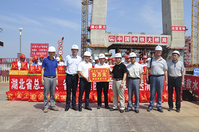 8月6日,省總工會(huì )黨組成員、副主席劉曉林,省總工會(huì )經(jīng)濟技術(shù)勞動(dòng)保護部部長(cháng)李斌,省總工會(huì )組織部副部長(cháng)陳維一行到赤壁長(cháng)江公路大橋項目建設現場(chǎng),慰問(wèn)高溫酷暑下堅守崗位的一線(xiàn)職工,為職工們送上防暑降溫物資和慰問(wèn)金,并召開(kāi)座談交流會(huì )。湖北交投工會(huì )主席譚慧農參加慰問(wèn)活動(dòng)。