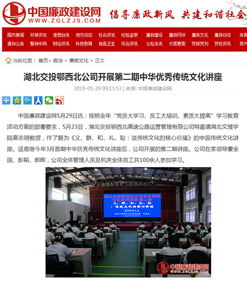 按照全年“黨員大學(xué)習、員工大培訓、素質(zhì)大提高”學(xué)習教育活動(dòng)方案的部署要求,5月23日,湖北交投鄂西北高速公路運營(yíng)管理有限公司特邀請湖北文理學(xué)院高志明教授,作了題為《義、群、和、禮、恥:談傳統文化的核心價(jià)值》的中國傳統文化講座。這是繼今年3月首期中華優(yōu)秀傳統文化講座后,公司開(kāi)展的第二期講座。公司在家領(lǐng)導董全國、彭韜、郭暉,公司全體管理人員及機關(guān)全體員工共100余人參加學(xué)習。