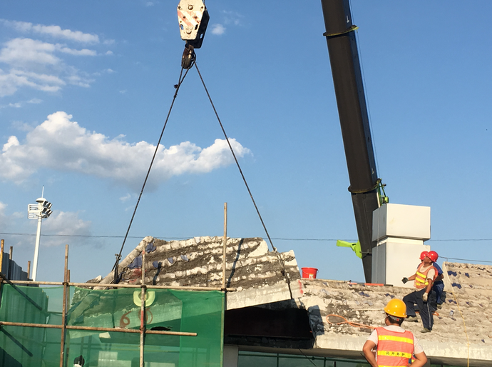 本次正線(xiàn)撤除工程采用機械拆除為主、人工拆除為輔的方式進(jìn)行施工,同時(shí)采用2臺繩鋸切割機對收費天棚進(jìn)行分塊切割,切除時(shí)由上往下減重拆除,先分塊分段拆除裝飾柱頂、現澆板及支撐梁,再分段切割立柱,從懸挑部分自外向內切割。每切一塊即采用吊車(chē)安全吊至運輸車(chē)內運至棄渣場(chǎng)統一處理。因為本次省界站正線(xiàn)拆除及路面恢復工程需在2019年12月低全部完成,輔線(xiàn)工程于2020年1月1日全國聯(lián)網(wǎng)運行后實(shí)施拆除。為保障前往河南方向一側正常收費運營(yíng),故保留輔線(xiàn)鄖十向右側4車(chē)道正常通車(chē)。