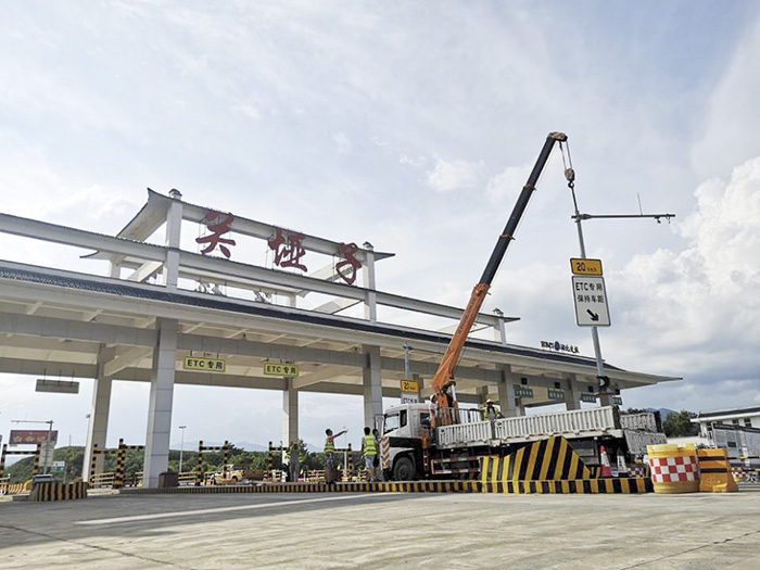 為保障省界收費站正常收費運營(yíng),本次正線(xiàn)拆除工程采用機械拆除為主、人工拆除為輔的方式進(jìn)行施工。按照“先上后下、先非承重后承重結構”的拆除順序進(jìn)行,首先拆除收費天棚頂的廣告牌、標志、瓦片等,再拆除收費天棚內的吊頂等附屬設施,隨后拆除天棚主體結構,最后拆除收費島。