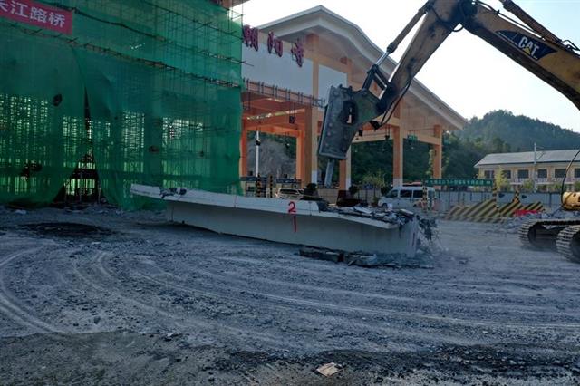 朝陽(yáng)寺收費站是恩施州境內需拆除的5個(gè)省界收費站之一,其設計呈“合”字形,帶有斜面并覆蓋琉璃瓦的不規則物理結構形狀。第一階段正線(xiàn)拆除工程共732.72平方米,采用機械拆除為主、人工拆除為輔的方式先破除琉璃瓦,然后使用繩鋸切割機對收費天棚進(jìn)行分塊切割,并用吊車(chē)吊裝運至地面進(jìn)行破碎,待天棚切割完成后再對承重柱進(jìn)行拆除,最后進(jìn)行路面附著(zhù)物清理及路面恢復工程,預計10天內拆除完成。