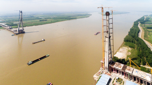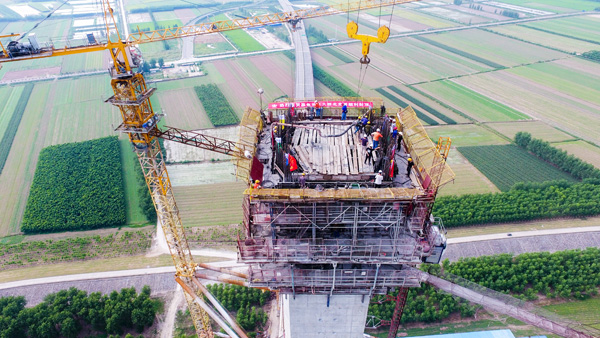 圖:大橋北岸主索塔封頂現場(chǎng)