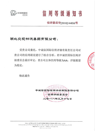 近日,中誠信國際信用評級有限責任公司發(fā)布信用評級報告,評定湖北交投物流集團公司主體信用等級為AA級,評級展望為穩定。