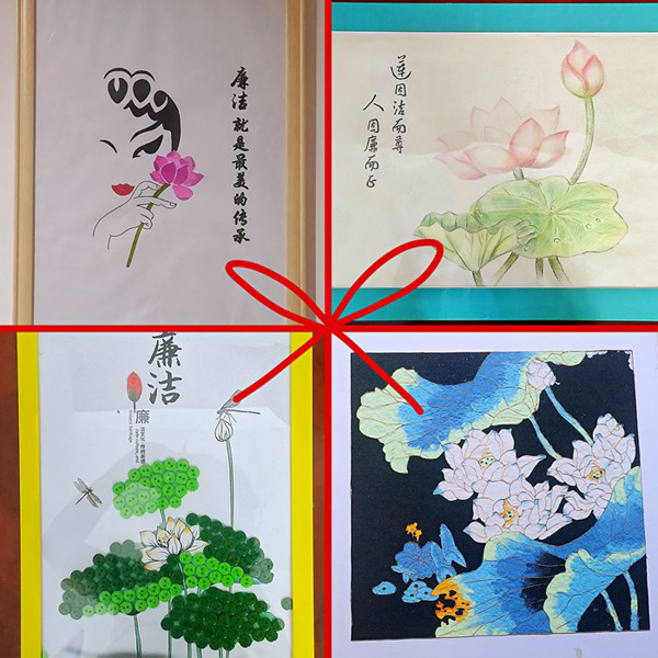 “巧手”警廉。“高手在民間啊,這些精致的作品真看不出來(lái)是都是廢棄品做出來(lái)的?!薄皩⒘幕允止ぷ髌返男问秸宫F出來(lái),即新穎又生動(dòng),一眼就能心領(lǐng)神會(huì )?!秉h員群眾以“廉”的多種表現形式來(lái)述廉、暢廉、學(xué)廉。一件件刻板畫(huà)、絲線(xiàn)畫(huà)、易拉罐拼畫(huà)等類(lèi)型的廉政作品,設計精巧、形象生動(dòng),巧妙地融入了“廉”的精髓?!拔覀兊慕z線(xiàn)作品為“愛(ài)廉說(shuō)”,以蓮花為切入點(diǎn)來(lái)制作,是因為廉政文化與蓮花的出淤泥而不染,濯清漣而不妖有著(zhù)異曲同工之妙,寓意了借蓮之高潔奉獻之品,明清正廉潔之志”孝感黨支部政工員介紹道。