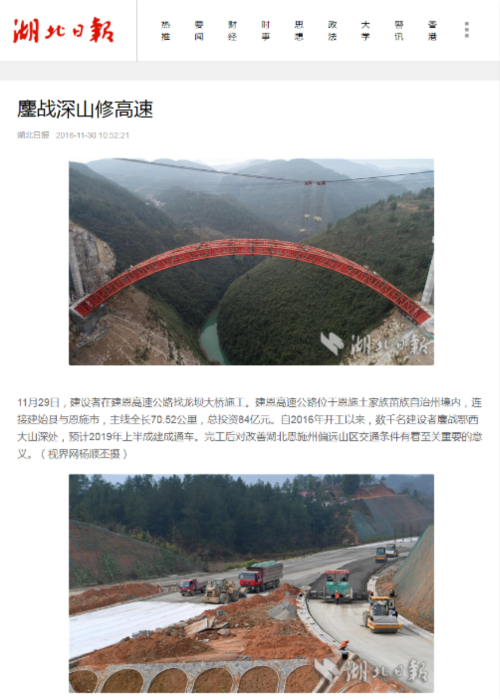 建恩高速公路位于恩施土家族苗族自治州境內,連接建始縣與恩施市,主線(xiàn)全長(cháng)70.52公里,總投資84億元,由湖北交投投資建設。自2016年開(kāi)工以來(lái),數千名建設者鏖戰鄂西大山深處,預計2019年上半成建成通車(chē)。完工后對改善湖北恩施州偏遠山區交通條件有著(zhù)至關(guān)重要的意義。(視界網(wǎng)楊順丕攝)