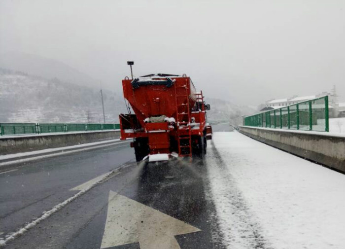 緊急裝載10余噸融雪劑,前往重點(diǎn)路段開(kāi)展除雪工作