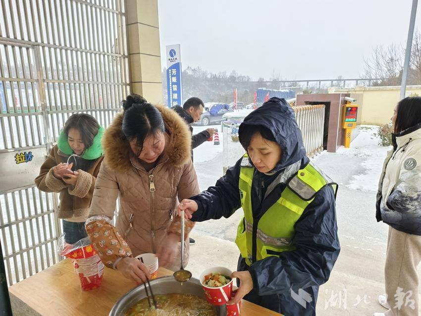 “師傅您的面,小心有點(diǎn)燙?!?1日早上7點(diǎn),京珠運營(yíng)公司芳畈管理所“芳華”志愿服務(wù)隊的員工們冒著(zhù)嚴寒,為受困司乘送上了熱氣騰騰的面條。