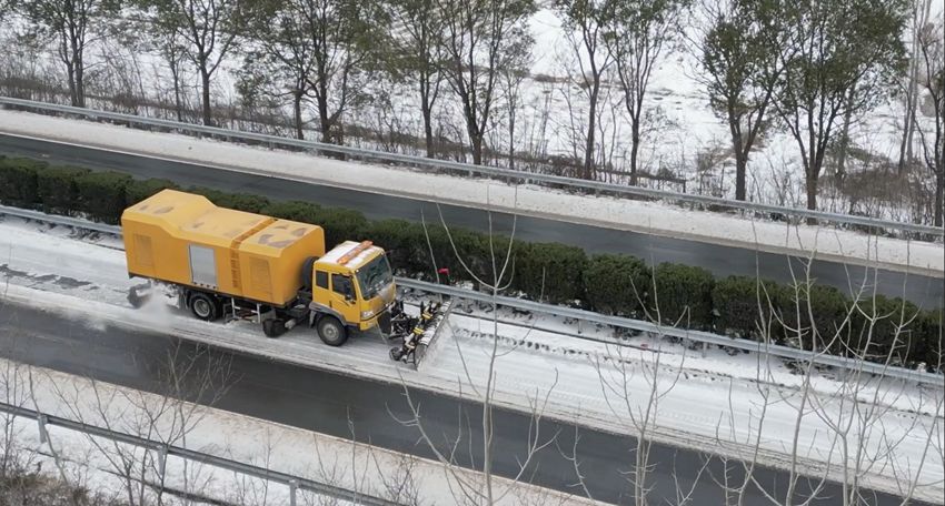 “冰粒與雪水融合后極易在路面、橋面形成覆冰層,這時(shí)要加大融雪劑的播撒頻次和冰粒的清掃力度,不能讓路面結冰?!比谘┸?chē)駛上橋面,液體融雪劑從車(chē)尾噴灑而出,將殘留的冰?;癁樗疂n。