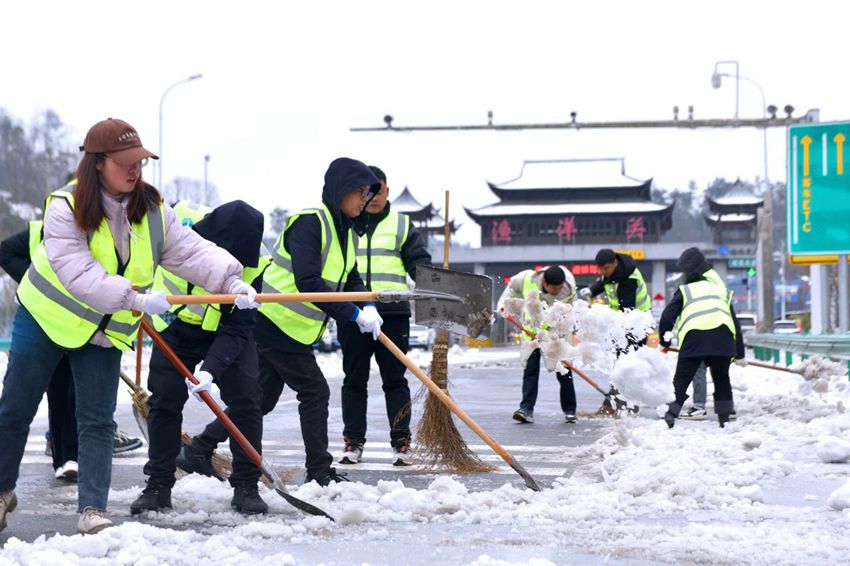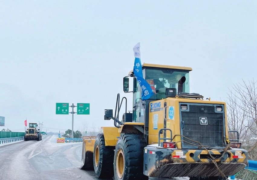 與時(shí)間賽跑,與冰雪戰斗?!氨仨毤辛α看驓灉鐟??!焙L(fēng)呼嘯中,湖北交投建設集團指揮調度人員機械投入戰斗。