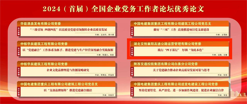 4月13日,以“發(fā)揮黨建對企業(yè)高質(zhì)量發(fā)展的引領(lǐng)保障作用,發(fā)展新質(zhì)生產(chǎn)力,推進(jìn)中國式現代化”為主題的“2024(首屆)全國企業(yè)黨務(wù)工作者論壇”在北京隆重舉行。論壇發(fā)布了優(yōu)秀論文名單,由湖北交投襄陽(yáng)運營(yíng)公司黨委報送的《推動(dòng)國有企業(yè)在完善公司治理中加強黨的領(lǐng)導研究》和《踐行“四下基層” 厚植為民本色》兩篇論文從1025家企業(yè)800余篇論文中脫穎而出,獲評“2024(首屆)全國企業(yè)黨務(wù)工作者論壇優(yōu)秀論文”。