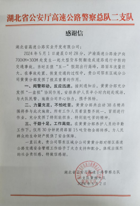 5月4日,高開(kāi)公司鄂東分公司收到一封來(lái)自湖北省公安廳高速公路警察總隊二支隊黃梅大隊的感謝信,對鄂東分公司黃黃分部在5月1日凌晨大型貨車(chē)側翻事故處置中的應急處置能力給予充分肯定,并致以感謝。