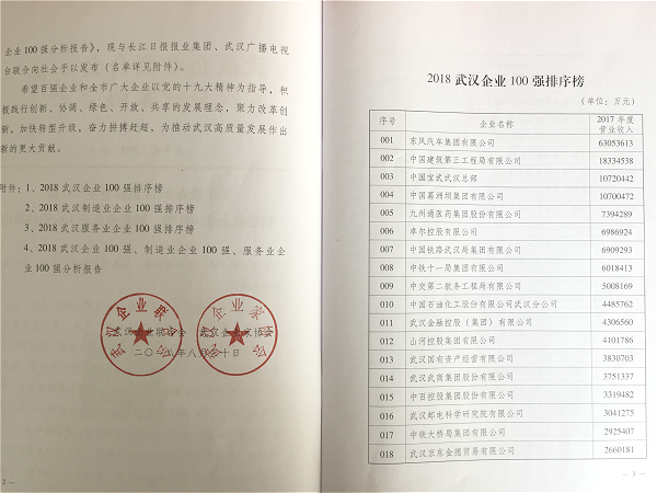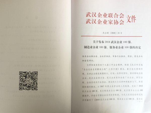 圖:集團公司位列2018武漢百強企業(yè)第24位