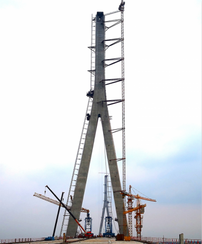 斜拉索是斜拉橋的重要組成部分,是主梁和主塔連接的紐帶,被視為斜拉橋的“生命線(xiàn)”。嘉魚(yú)長(cháng)江公路大橋共有120對斜拉索,南塔、北塔各60對。其中,最短索長(cháng)128.1米、重6噸,最長(cháng)索長(cháng)494.6米、重40.9 噸。斜拉索施工工序復雜、技術(shù)難度大、安全風(fēng)險高,索導管定位及轉換裝置錨固點(diǎn)定位要求精度高。為確保高質(zhì)量完成斜拉索施工,項目部科學(xué)安排,周密部署,精心編制施工技術(shù)方案,攻克了多道技術(shù)難關(guān)。