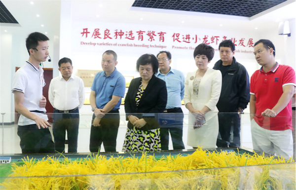 圖:王紅玲一行參觀(guān)小龍蝦選育繁育中心展廳